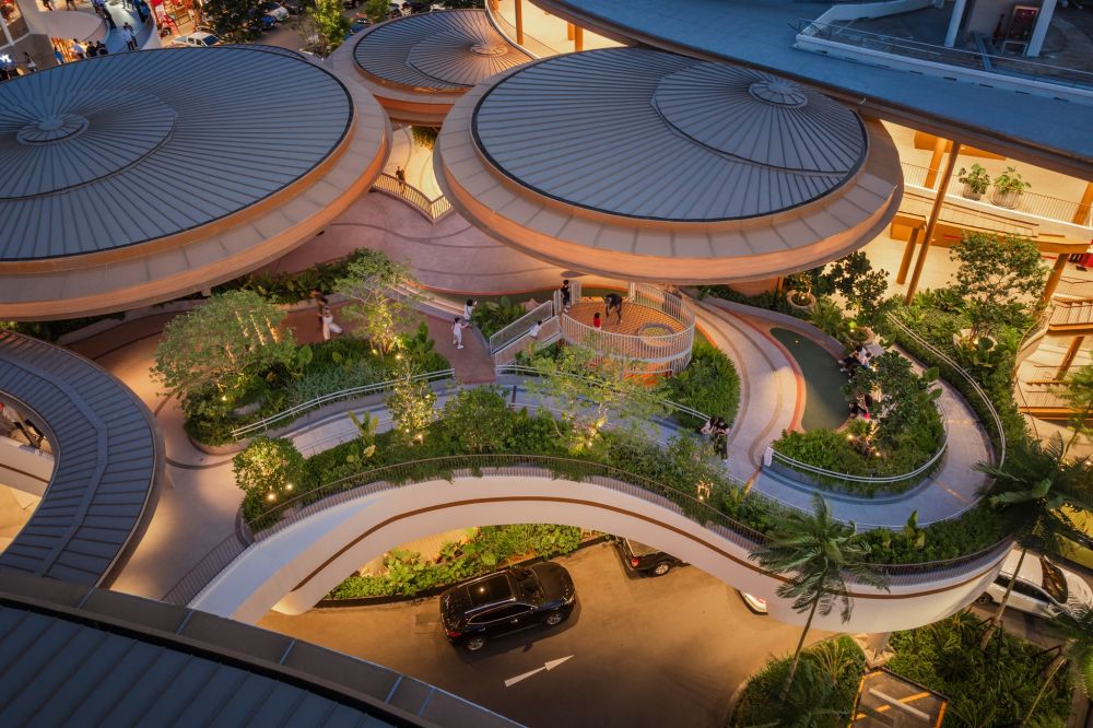 外观设计上,以反映庭院本质的“雨伞屋顶”形成独特的视觉标识,热烈地欢迎着每位游客的到来。其延伸出的半户外、遮阳的区域,结合天然的木质材料,错落优质的绿植布景,营造出温暖舒适、亲近自然的氛围,是郁郁葱葱的立体花园、儿童游乐场和消磨空闲时光的社交聚集地,让人们忘记压力,放松下来。