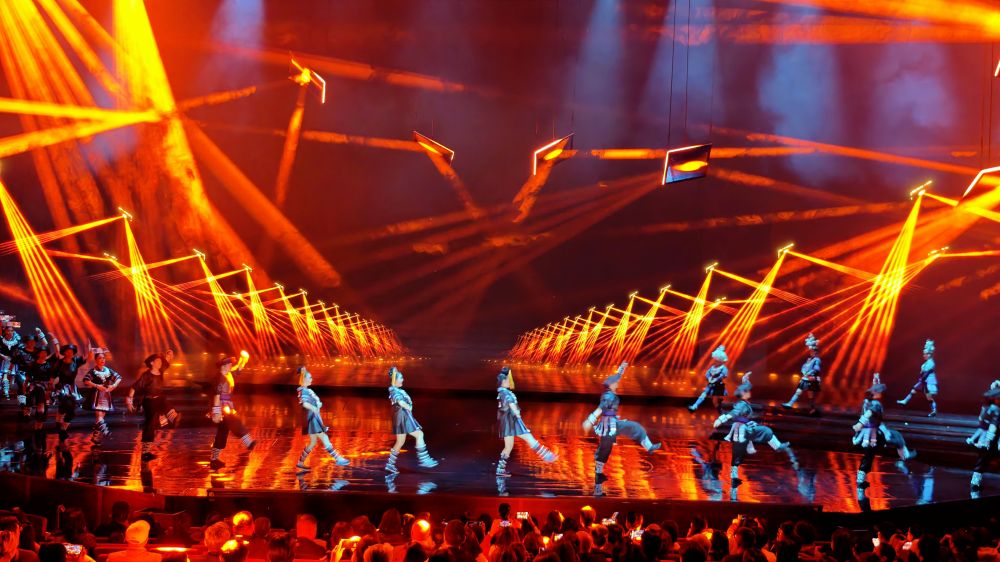 穿透力十足的极窄光束经108块数控动力镜面精妙折射变幻,配合CMY混色系统输出炫目色彩,光影交织间,贵州地区那跌宕起伏的山地丘陵、温润多变的气候特征等独特地域风貌若隐若现,为历史悠久的非遗文化增添现代光辉,仿佛身处非遗“蹦迪”现场。
