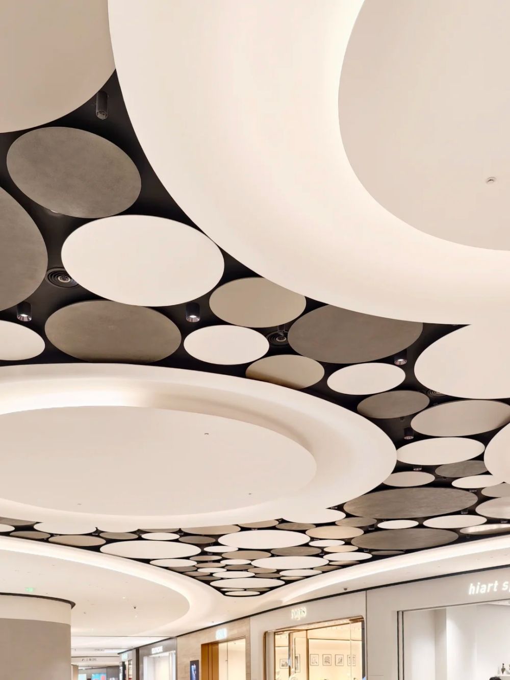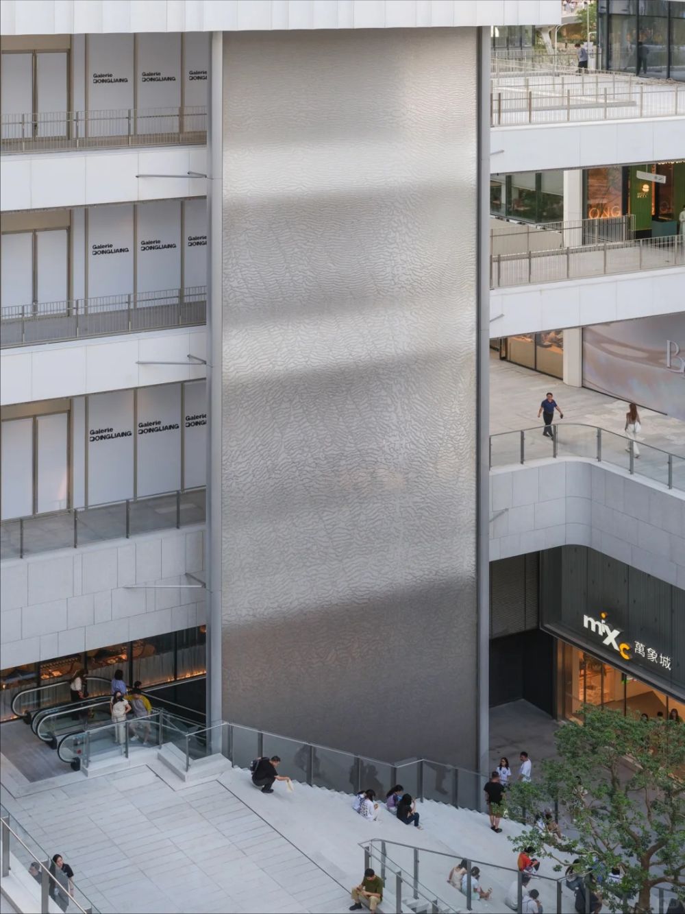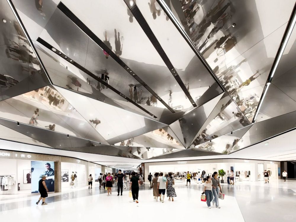 局部采用极具艺术感的多面镜面金属材质拼接设计,通过不规则的几何形态与镜面反射,营造出强烈的视觉冲击力,呈现出未来感与艺术感兼具的商业空间氛围。