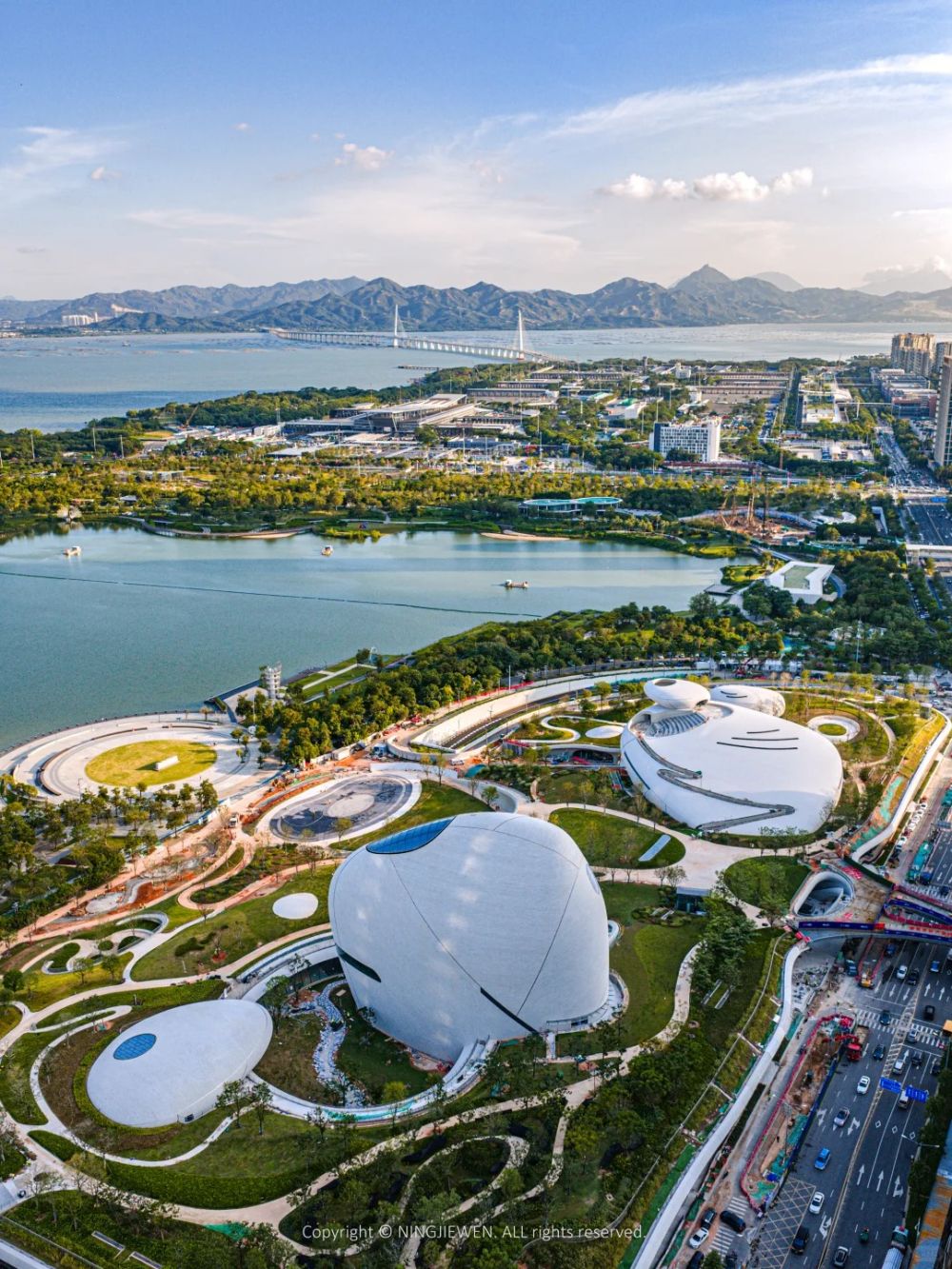 广场以“开放、品质、生长”为理念,向世界发出“为未来设计 Design for Future”的精神宣言。设计以“水落石出”为核心理念,将建筑化作地景的一部分,九个石状建筑散落于城市与海湾之间,建筑主体隐入草坡屋面下,形成自然、建筑与城市融合的开放景观。