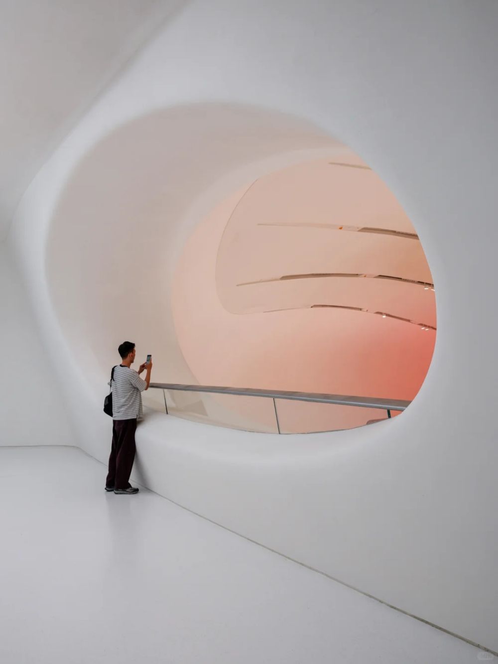建筑场景以柔和通透为基调,大量运用弧形元素取代生硬棱角—— 从入口穹顶到连廊弧度,每一处曲线都传递出治愈感;摒弃过度的装饰,专注以高品质用材呈现简洁优雅的质感,实现自然与商业的共生。