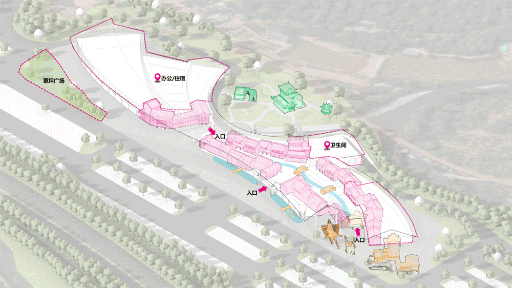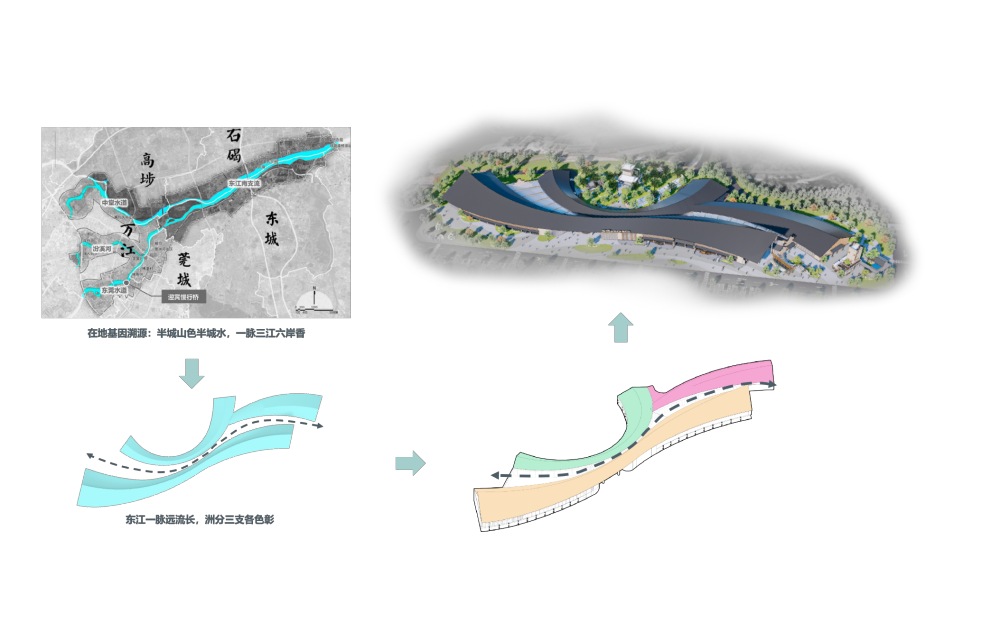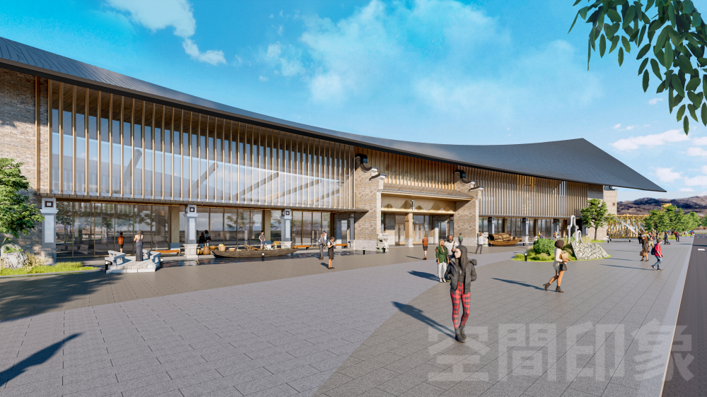 建筑设计上,突破传统服务区大体量封闭式的惯性设计思维,以岭南传统民居为基地,结合莞城三江六岸的流线形态,对建筑形态与景观布局进行当代转译,以全新的形式再现山环水绕的视觉意象,形成“山为屏、水为脉、文为韵”的半开放格局。