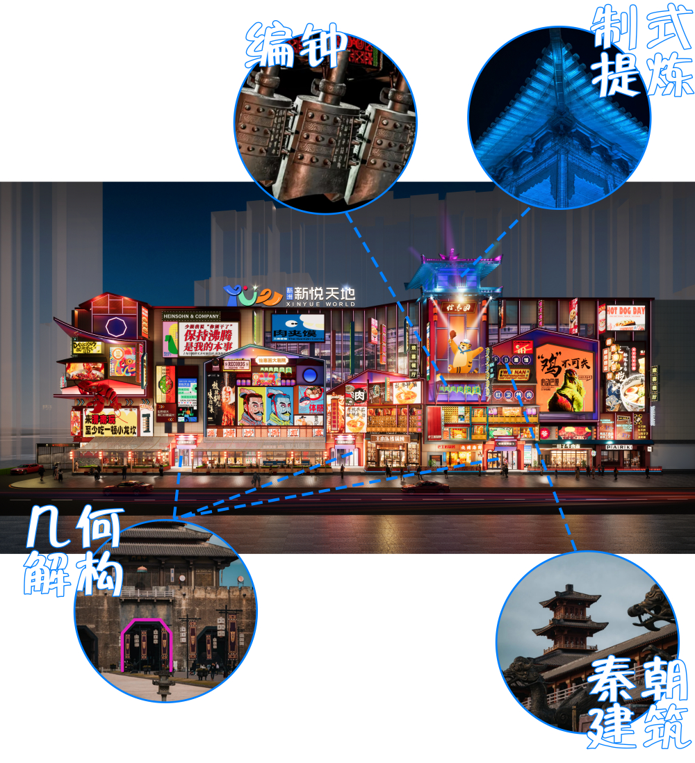 怡惠园根植于#渭南 在地文化,空间印象将秦汉时期的渭城重现,从秦朝塔楼、编钟提取建筑制式,结构重组与新材料融合演变为怡惠园的标志性装置,融入项目IP加强新洲·新悦天地品牌塑造。