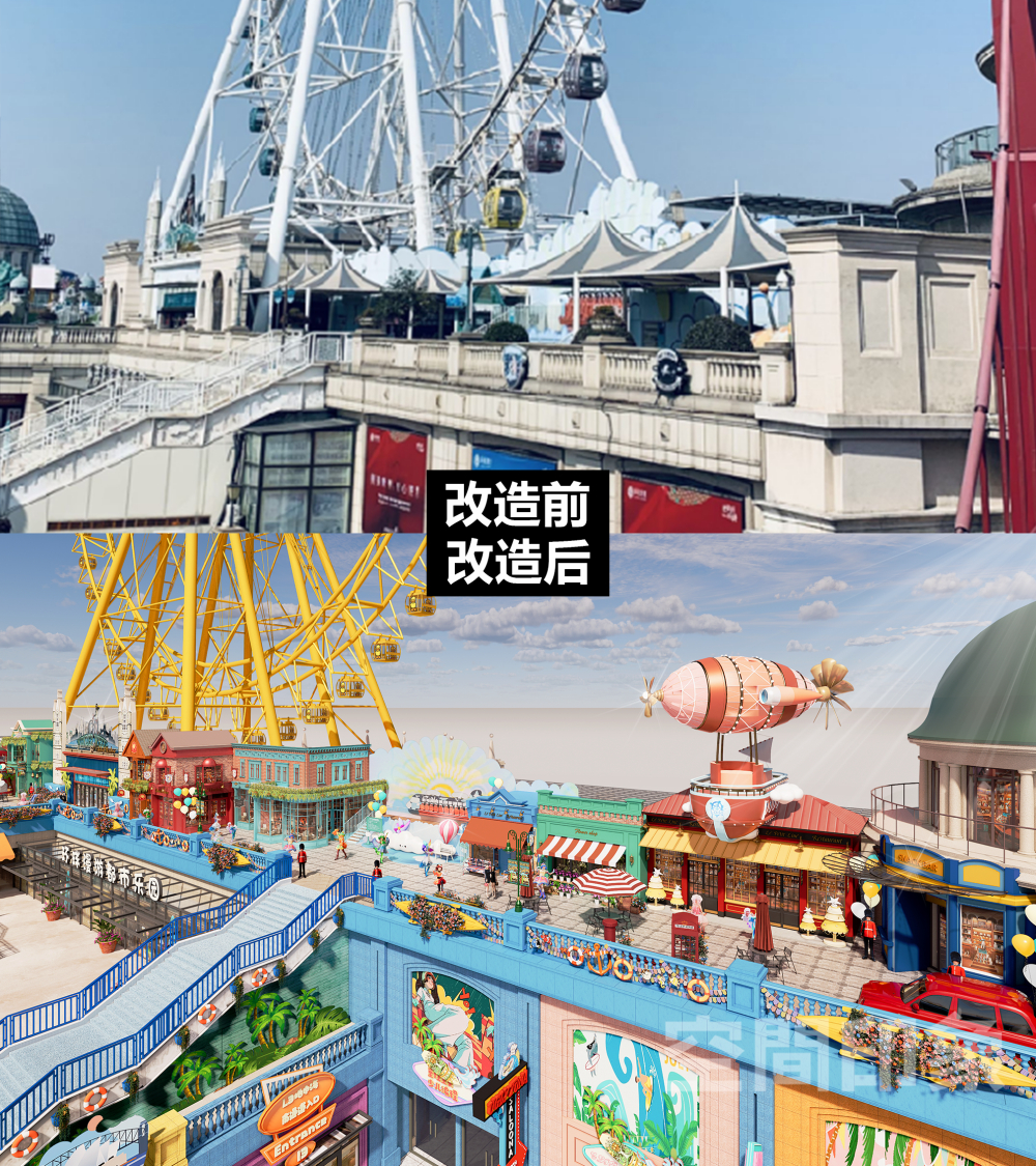 不止于广场空间的焕新,我们更进一步挖掘屋顶潜力,依托场地原生元素基因,以高饱和度活力色彩搭建沉浸式场景基底,植入趣味游乐设施,融合休憩、打卡、美陈市集等多元功能,全方位加码空间吸引力。