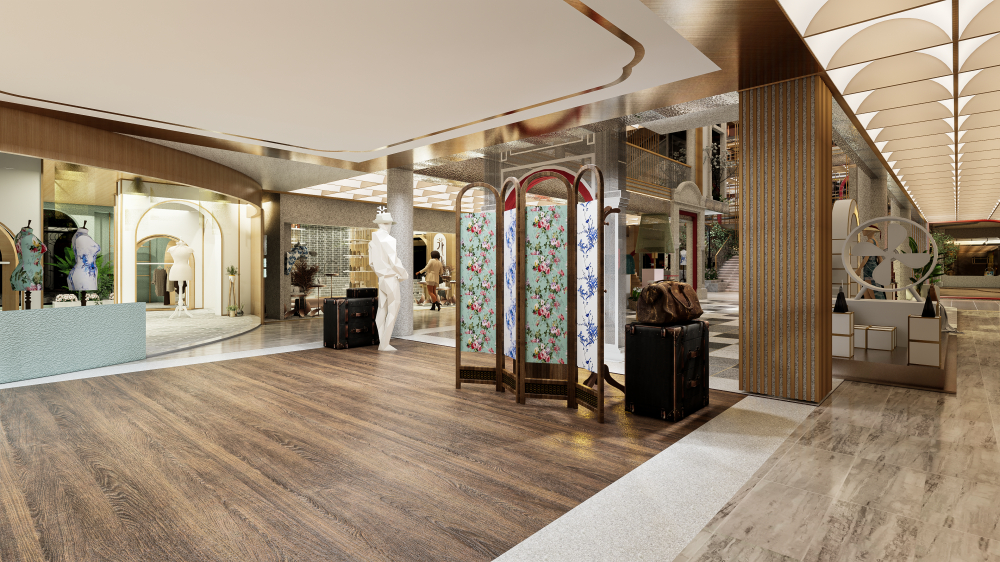 利用空间表现时间,从黑胶机中窥视的老城上海到东西古今集一身的魔都,跨越时间前往的未来上海;错位的空间构造将现实与超现实折叠,将复古与时尚交接,打造属于上海人的2046。