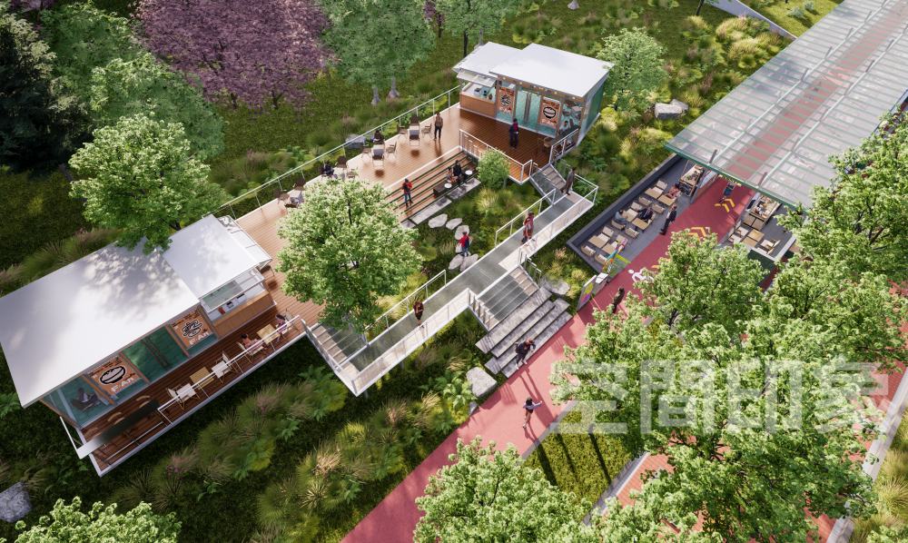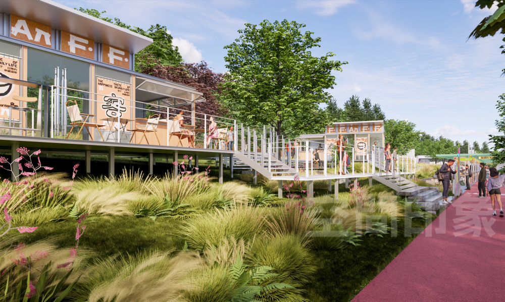 采用双层空间结构 (架空木质平台+生态草坡) ,上层观景社交,下层亲子休憩,打破传统街区“平面化”的单调感,实现商业与自然无缝衔接。