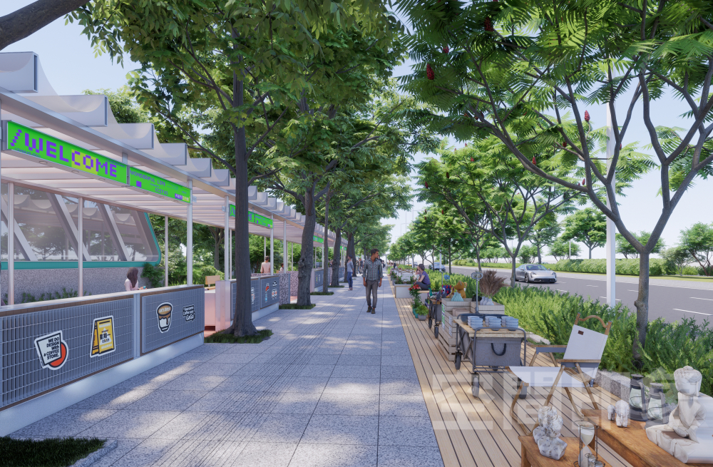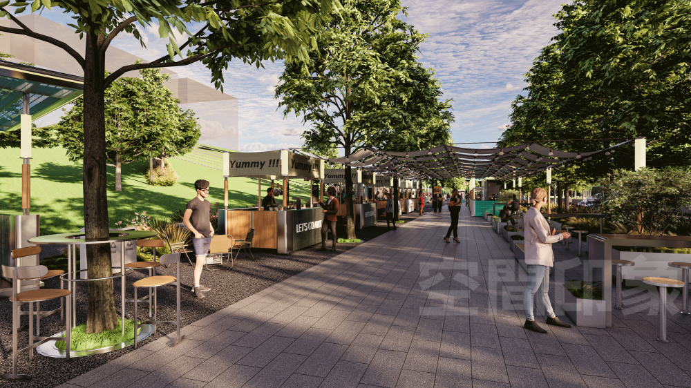 我们将医院周边、地铁口旁的沿街灰空间,改造为轻量商亭集群+阶梯式休憩看台,以现有的乔木为骨架,搭配高低错落的生态草坡、花境植被,把原本单调的步行道,打造成“林下漫游林径”,让逛街如同逛城市公园,天然降温又治愈。