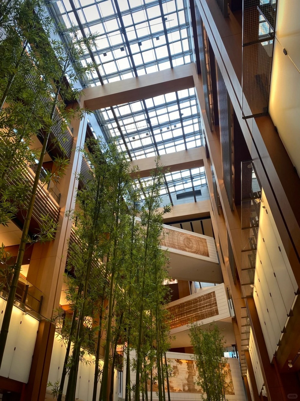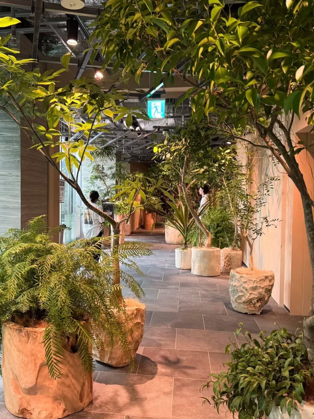 长廊不再是一眼望到底的通道,而是每隔一段距离,就出现一组由绿植、原木或石材构成的景观节点,将枯燥的行走切割成一段段探索的旅程,人们围绕着这些自然节点驻足、交谈,原本被快速通过的动线,瞬间变成了有温度的聚落。