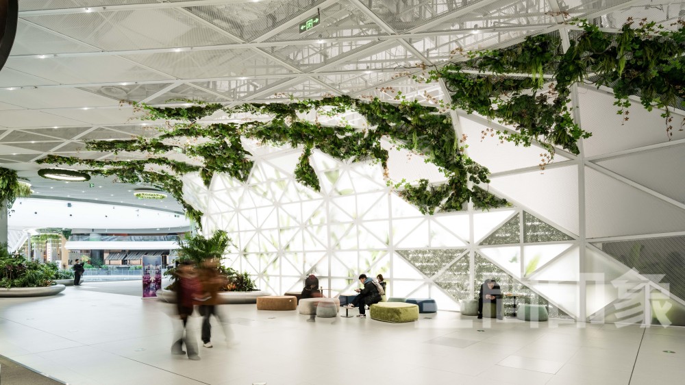 我们面对原本缺乏聚焦点的公区,通过寻求空间与自然生态中寻的平衡状态,绿植把清新的自然环境带入商业空间中,二者相互协调、相容共生,不仅增加了空间的主题感,亦为空间营造出自然而然的轻松氛围,让紧绷的心灵随时可以放松。